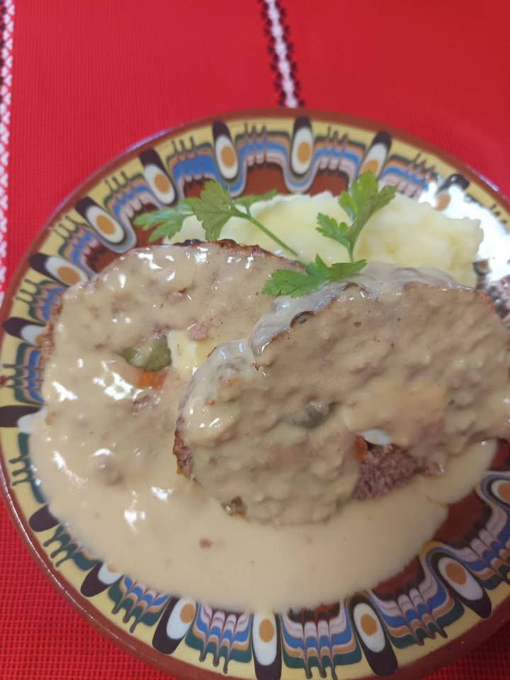 Bulgarian Meatloaf with mashed potatoes and sauce