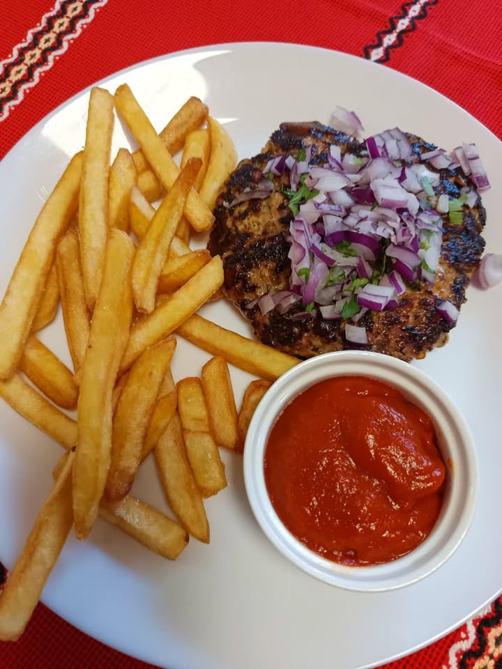 Pljeskavica (Hamburguesa serbia rellena de bacon y queso) con patatas fritas